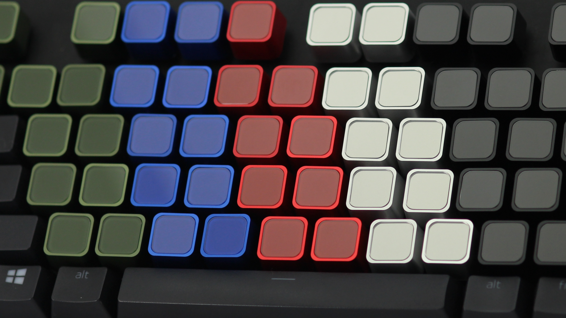 Each keycap has a hand polished and painted sapphire crystal inlayed into the top of the keycap.